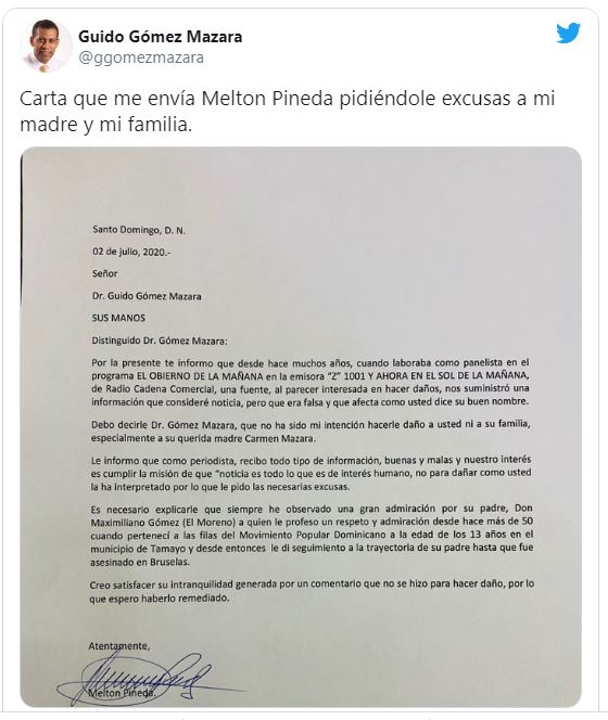 SANTO DOMINGO.- El comunicador Melton Pineda pidió disculpas al dirigente político Guido Gómez Mazara, por un comentario con información falsa que vertió en su contra.