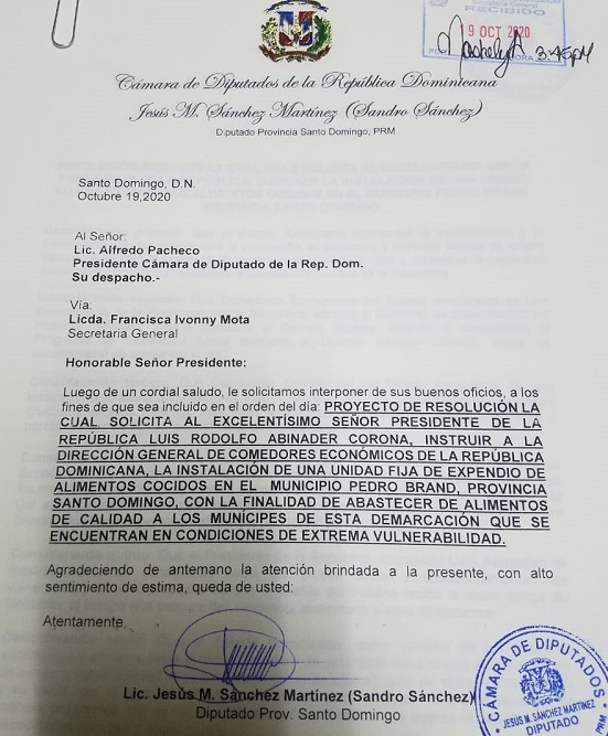 PEDRO BRAND.- El diputado del Partido Revolucionario Moderno (PRM), por la circunscripción cinco de la provincia Santo Domingo, Jesús Sánchez Martínez (Sandro Sánchez), sometió ayer al Congreso Nacional la aprobación de una resolución que solicita al presidente de la República, Luís Abinader Corona, la instalación de un “Comedor Económico” de manera permanente en el municipio Pedro Brand.