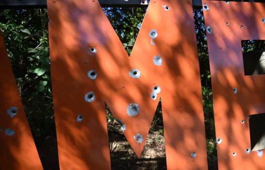 El rótulo, ubicado en la carretera El Mamey-El Cruce de Guayacanes, presenta múltiples agujeros provocados por impactos de bala.