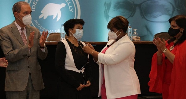 La ministra de la Juventud colocó un “pin” emblemático en honor a la trayectoria de la pionera en el desarrollo de las Ciencias Marinas en el país, Idelisa Bonnelly, a las jóvenes estudiantes Thara Rubí Caba Pineda y Esperanza Emilia Mendoza Reyes, quienes de manera simbólica representaron a todas las favorecidas con las becas.