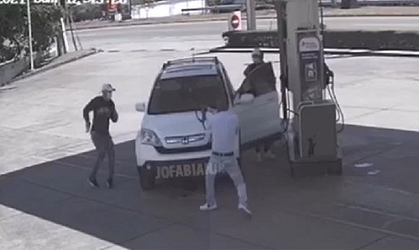 De acuerdo a un video de cámara de seguridad de la estación Total de Las Palomas, en la referida ciudad, se puede ver a los individuos echar combustible a la yipeta marca Honda CRV, color blanco, cuando uno de ellos se desmontó con pistola en manos con la intención de robarle el arma asignada al vigilante, quien fue identificado como Julio Gómez, de 50 años de edad.