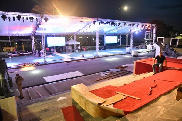 Sin perder tiempo se observa cómo acondicionan las escalinatas de la parte frontal de la Casa de Gobierno, donde se ven desenrollar inmensos rolos de alfombras rojas que adornarán el espacio, el cual también contará con gigantescas pantallas y vistosas luces.