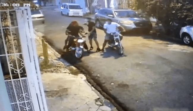 El robo quedó captado en una cámara de vigilancia, donde dos individuos le atravesaron una motocicleta a tres personas que se trasladaban en otra, y mediante amenaza e intimidación con un arma de fuego, se apropiaron de la motocicleta en que viajaban las víctimas, sin prestar resistencia.