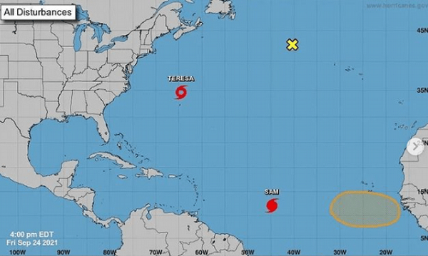 Sobre el huracán Sam, tiene vientos máximos sostenidos de 175 kilómetros por hora y se encuentra a unos 1,830 kilómetros al este/sureste de las Antillas Menores, con movimientos al oeste/noroeste a unos 20 kilómetros por hora.