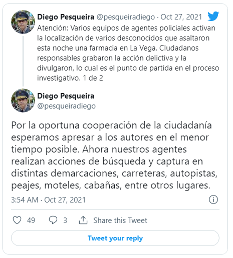 «Por la oportuna cooperación de la ciudadanía esperamos apresar a los autores en el menor tiempo posible. Ahora nuestros agentes realizan acciones de búsqueda y captura en distintas demarcaciones, carreteras, autopistas, peajes, moteles, cabañas, entre otros lugares», indicó Pesqueira en su cuenta de Twitter.