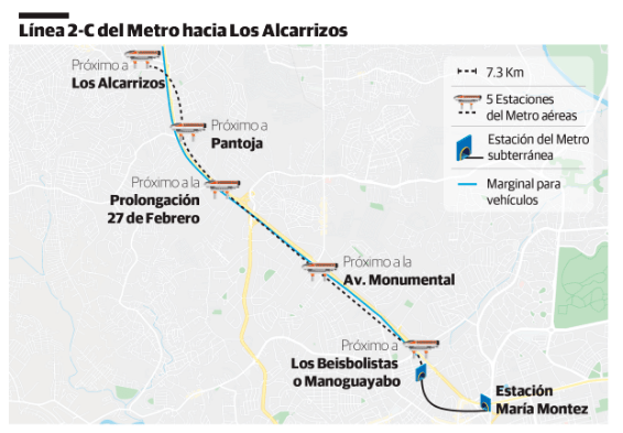 LOS ALCARRIZOS.- La línea 2-C del Metro de Santo Domingo que uniría la estación María Montez, en el kilómetro 9 de la autopista Duarte hasta la entrada del municipio Los Alcarrizos, solo tendrá 800 metros soterrada y los restantes 6.5 kilómetros serán un viaducto aéreo con cinco estaciones y con una avenida marginal, de acuerdo con informaciones suministradas por la Oficina para el Reordenamiento del Transporte (OPRET).