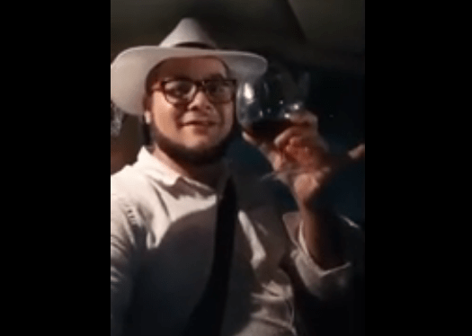 Al ritmo de la bachata “Loco de amor”, que interpreta Luis Vargas, Galván conduce un vehículo y tomando ron, en una copa de vidrio, y grabándose.