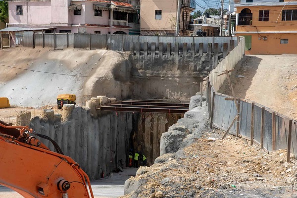 En el extremo, en el Barrio Enriquillo se han realizado movimientos de tierra, excavaciones, se han hecho rellenos compactados para el lote completo, hincamiento o construcción de pilotes metálicos que conformarán el portal del túnel de entrada, construcción de la estructura metálica de soporte en la entrada del túnel conocido como bastidor.