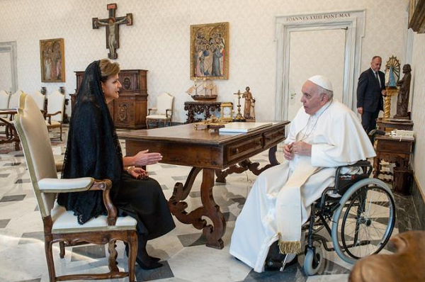 Peña agradeció al Papa Francisco, por la distinción de recibirla y conversar sobre el papel de la diplomacia eclesiástica para garantizar la convivencia mundial en momentos tan difíciles como una guerra.