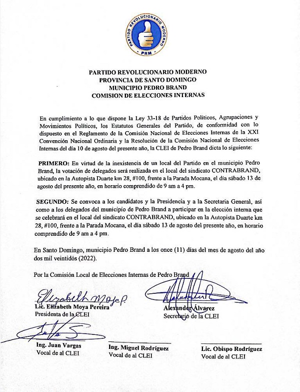 PEDRO BRAND.- La Comisión Local de Elecciones Internas (CLEI) del Partido Revolucionario Moderno (PRM) en Pedro Brand dictaminó este jueves que el proceso eleccionario que llevará a cabo esa organización el próximo sábado 13 del corriente mes, se hará en el local de la Compañía de Transporte de Pasajeros de Pedro Brand (COTRABRAND), ubicada frente a la parada Mocana del kilómetro 28 de la autopista Duarte.
