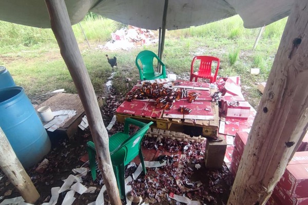 De acuerdo con la información, las autoridades ocuparon diferentes cajas con logos de bebidas alcohólicas de marcas reconocidas entre ellas 303 cajas vacías, 675 cajas sin armar, 21 rollos de etiquetas, 7 rollos de cintas masking tape, varios paquetes de etiquetas de cuello de botella, 551 cajas de ron de 175 mililitros de alcohol y 144 de 350 ml, además de tres blowers industriales para poner etiquetas.