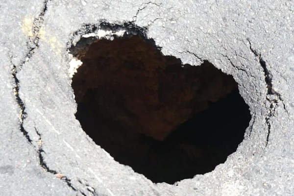 Hasta el momento se desconoce la causa del peligroso socavón, que apenas tiene limitada una delgada capa de arcilla que sostiene el pavimento.