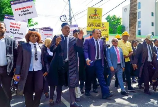 SANTO DOMINGO.- Cientos de Abogados marcharon desde la sede del Colegio de Abogados de la República Dominicana(CARD) en la avenida Bolívar hasta la Superinentendencia de Pensiones exigiendo el derecho a pensiones por edad, vejez, por discapacidad y de seguro médico para los profesionales del Derecho que laboran de manera independiente, como está contemplado en la Ley de Seguridad Social 87-01.