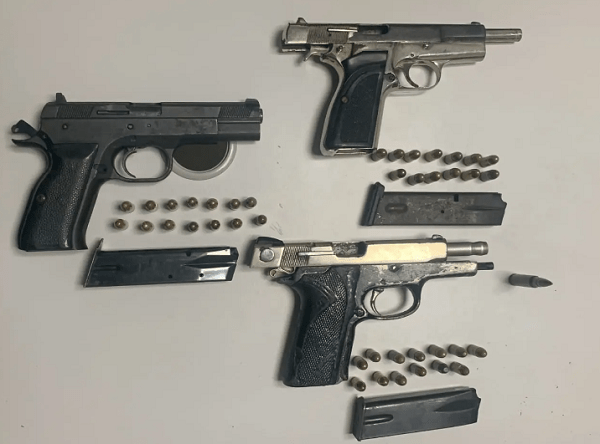 Posteriormente en presencia de un fiscal adjunto, se inició una requisa al vehículo ocupando escondidas en el interior de la puerta delantera del pasajero, tres pistolas con sus cargadores y varias municiones.