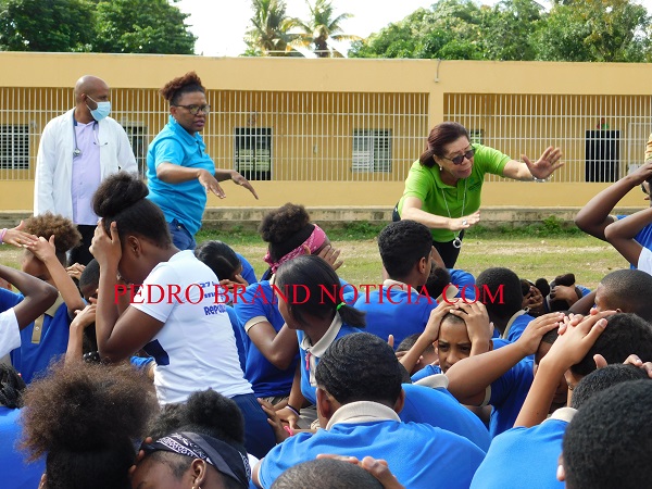 Los estudiantes fueron guiados por personal docente y administrativos del centro educativo, hasta congregarse en la cancha deportiva ubicada frente a la escuela, localizada detrás del hospital Rodolfo de la Cruz Lora y el Centro de Rehabilitación Psicosocial Padre Billini.