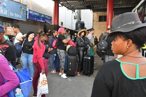 Con sus bultos y maletas en mano, los pasajeros de la parada que conduce a Neyba, Tamayo y Barahona, esperan abordar los autobuses mientras hacen largas filas, razón por la que algunos se quejaron debido a los retrasos.