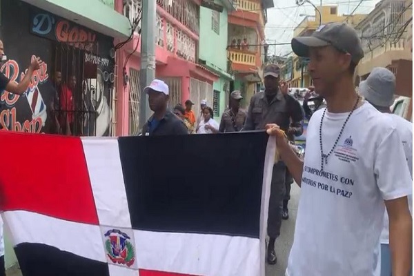 La marcha la encabezaron feligreses de la parroquia Santa Luisa de Marillac y protestantes de la Iglesia de Dios Pentecostal Jesucristo Rey y Señor, del sector Los Tres Brazos junto a agentes del Viceministerio de Seguridad Preventiva en Sectores Vulnerables, de la Policía Nacional.