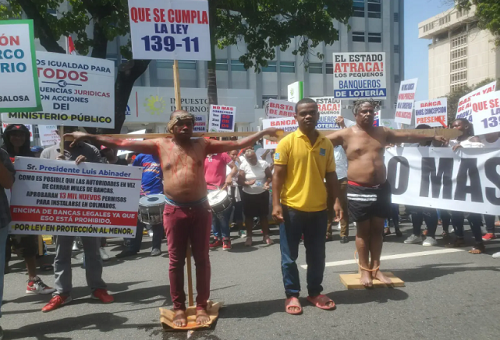 SANTO DOMINGO.- Miembros de la Federación Nacional de Bancas de Loterías (Fenabanca) protestaron la mañana de este miércoles frente al Ministerio de Hacienda, en demanda a la incautación de las máquinas de ventas ambulantes y el cumplimiento de la Ley 139-11.