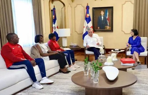 SANTO DOMINGO.- El presidente Luis Abinader junto con la primera dama Raquel Arbaje, recibió la tarde de este viernes en su Despacho Presidencial a la campeona del mundo en los 400 metros planos de atletismo, Marileidy Paulino.