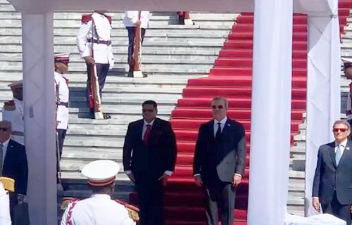 SANTO DOMINGO.- El presidente Luis Abinader recibe este jueves en visita oficial a su homólogo de la República de Surinam, Chandrikapersad Santokhi, con los honores correspondientes y los himnos nacionales de ambos países.