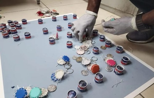 Por instrucciones del fiscal se procedió a abrir el paquete encontrando, decenas de llaveros en forma de tamboritas, bates y pelotas de béisbol, descubriendo en 36 de esas pequeñas artesanías, más de medio kilogramo de cocaína, con un peso preliminar de 510 gramos.