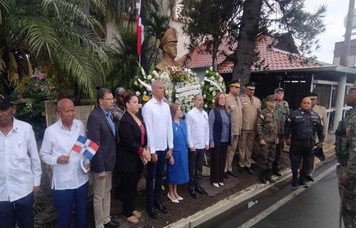Representantes de la Comisión Permanente de Efemérides Patria, Fundación Lora Fernández, el Ministerio de Defensa y la gobernación provincial de Santiago depositaron ofrendas florales en la estatua de Juan María Lora Fernández, ubicada en la parte frontal del hotel, caído en combate durante la gesta.