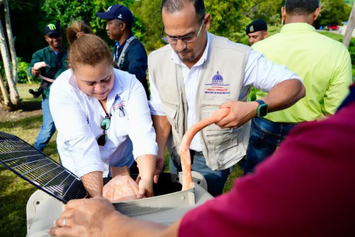 Los técnicos Luis Aníbal José Amparo e Indira Sanchez, inspectores del Departamento de Regulación y Control de Vida Silvestre de la Dirección de Biodiversidad, rescataron las aves en Flamingo Jungle, un espacio de alojamientos que se oferta a través de la plataforma Airbnb.
