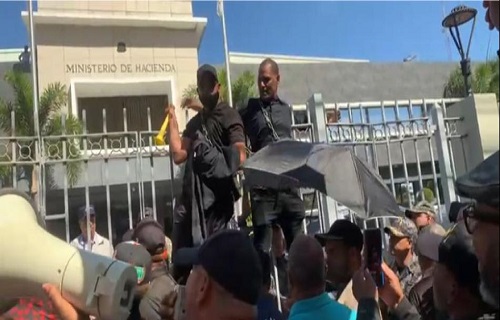 SANTO DOMINGO.- Dos agentes pensionados se amarraron con cadenas en las puertas del Ministerio de Hacienda, donde se manifiestan en reclamo de sus indemnizaciones.
