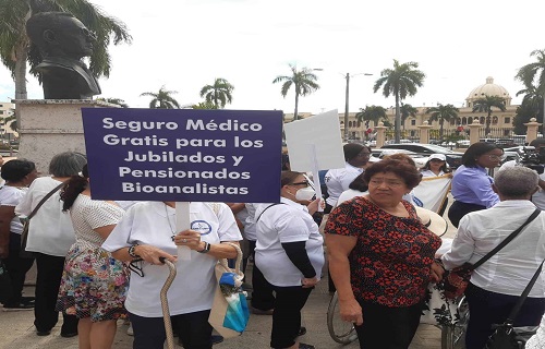 SANTO DOMINGO.- Bioanalistas pensionadas y jubiladas protestaron este jueves en las inmediaciones del Palacio Nacional, en demanda del aumento de sus pensiones.