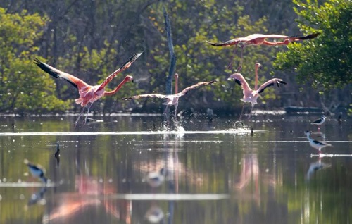 El flamenco del Caribe es una especie emblemática que habita en humedales de agua salobre, marismas y estuarios de la región.