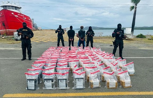 Agrega que al abordar la embarcación, sin nombre ni matrícula, se arrestaron a dos dominicanos a bordo, en cuyo interior se ocuparon 16 fardos, conteniendo un total de 754 paquetes de una sustancia que se presume es cocaína.