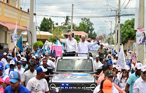 COTUÍ.- El presidente de la República y candidato presidencial por el Partido Revolucionario Moderno (PRM), Luis Abinader, encabezó este sábado una caravana junto al candidato a senador por la provincia Sánchez Ramírez, Ricardo de Los Santos, y otros aspirantes congresuales de esa localidad.