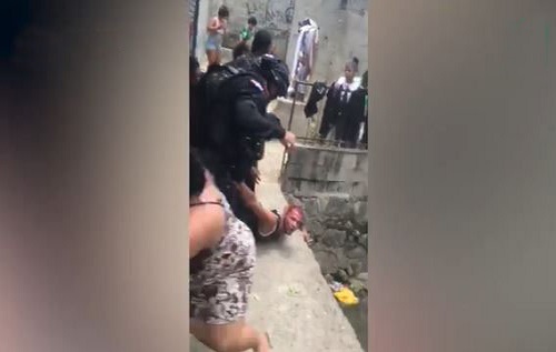 En la fílmica se observa a los policías pateando y golpeando a un joven sin identificar, quien se resistía a ser arrestado, mientras que otras personas presentes, aparentemente familiares del detenido, les lanzaban sillas y otros objetos a los policías.
