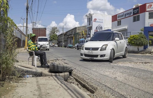 El deterioro de la calle Guarocuya, en ese tramo, es tal que para girar desde la Ballenilla es necesario tomar el carril contrario y evitar caer en el hoyo. En la acera sur, el problema se agrava porque aparentemente un vehículo pesado se subió y destruyó la plataforma que cubre el imbornal.