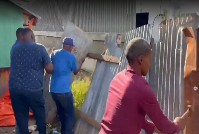DAJABÓN.- Comerciantes del mercado Ramón Flete (Mercadito de Las Verduras), en Dajabón, irrumpieron la mañana de este lunes a las instalaciones de esa plaza comercial, con martillos en manos y derribando el cerco de zinc pidiendo su terminación.