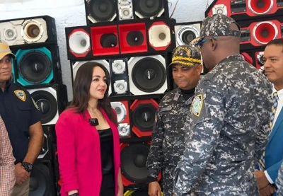 SANTO DOMINGO.- La ministra de Interior y Policía, Faride Raful , entregó a la Procuraduría Especializada de Medio Ambiente en Santo Domingo Oeste 225 bocinas incautadas en espacios públicos y centros de gastos de bebidas alcohólicas, dónde también decomisaron 205 cámaras de videovigilancia y más de 5,000 mil armas. blancas, durante la continuación de los operativos Garantía de Paz .