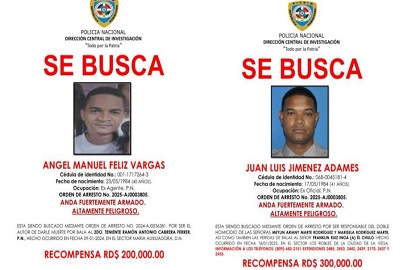 SANTO DOMINGO.- La Policía Nacional anunció este miércoles recompensas de 300,000 pesos y 200,000 pesos para quienes aporten información que permitan la captura de Juan Luis Jiménez Adames y Ángel Manuel Feliz Vargas, respectivamente, ambos exmiembros de la institución implicados en hechos criminales graves.
