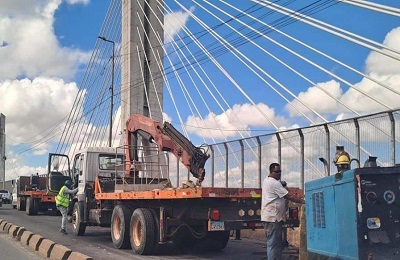 Una brigada del Ministerio trabaja en las juntas de expansión de la cabecera este del puente Francisco del Rosario Sánchez.