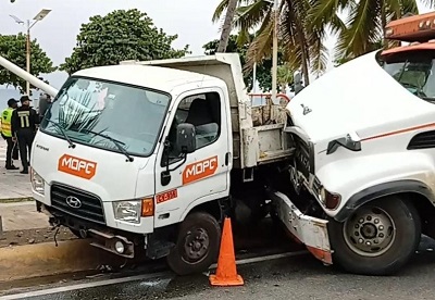 SANTO DOMINGO.- Un accidente de tránsito en la Autopista 30 de Mayo que involucró a un camión de carga tipo volteo y un vehículo del Ministerio de Obras Públicas y Comunicaciones (MOPC), dejó 10 personas heridas.