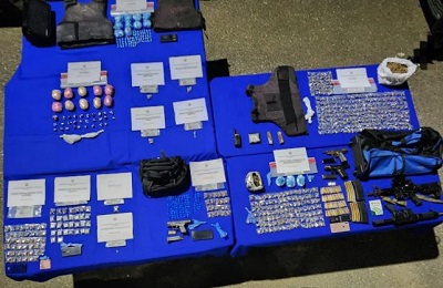 Se confiscaron además dos fusiles, tres armas de fuego, municiones, tres chalecos antibalas, una radio de comunicación, cuatro celulares, dos balanzas, una máquina selladora al vacío, dinero en efectivo y otras evidencias.