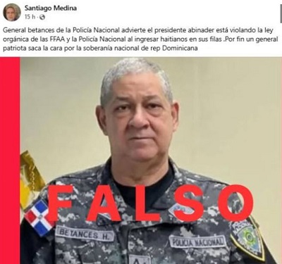 SANTO DOMINGO.- La Policía Nacional desmintió este viernes categóricamente una información que circula en redes sociales, en la que se atribuyen declaraciones falsas al general Julio C. Betances Hernández, y que ha sido difundida por los perfiles identificados como “Santiago Medina” y “Nigua RD”.