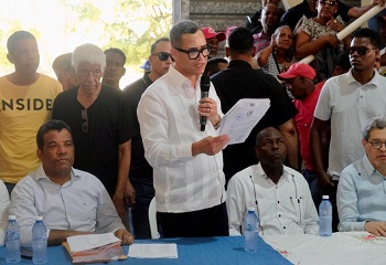 AZUA.- El ministro de Trabajo, Eddy Olivares, tras encabezar un acto celebrado en el polideportivo Bartolomé Olegario Pérez de Azua, al que asistieron cientos de trabajadores de los puertos y líderes comunitarios locales, aseguró que el Gobierno entregará el bono navideño completo y no permitirá los arbitrarios y abusivos descuentos que normalmente le algunos sindicatos.