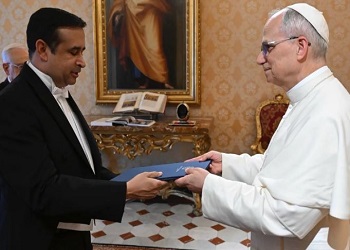 CIUDAD DEL VATICANO.- El Embajador Extraordinario y Plenipotenciario de la República Dominicana ante la Santa Sede, Víctor Valdemar Suárez Díaz, presentó hoy sus cartas credenciales ante su Santidad el papa León XIV e invitó al pontífice a visitar el país.