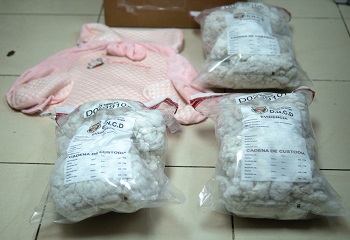 Con la coordinación de un fiscal, se inició una inspección más rigurosa, descubriendo en el interior un peluche de color rosado relleno de fibra de poliéster impregnada con cocaína.
