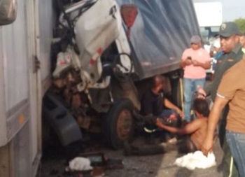 La víctima fue identificada como Derwin Ambiorix Medina, de 37 años, quien sufrió una fractura expuesta en una pierna al colisionar el camión en el que se desplazaba junto a José Ambiorix Disla Fabre, de 47 años, con otro vehículo de carga.